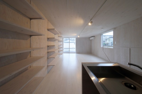 計画地は、福祉大学のすぐ近くであり、学生向けの賃貸がたくさん建つ場所である。多くの賃貸物件がある中で、他物件と競合せず差別化のできるアパートを計画した。間取りは、1.2階で分かれる1Kと1ルームが1戸ずつ、メゾネット型が6戸である。1.2階で分かれるタイプは、一般的な間取りではあるが主要室を合板仕上げとすることで多く使われる仕上げのクロスなどとは異なる独自性のある空間とした。また、壁に可動棚を自由に配置できる作りとなっている。メゾネット型の住戸は敷地形状によりL字型に建つ建物の形状に合わせて、4種類の間取りとなっており、1階に水回りを配置し2階が主要室となっている。水回りも2戸のみ浴室をユニットバスではなく製作しており、賃貸住宅では数の少ない置き型のバスタブや、スタンドシャワーなど高価な作りになっている。また、高台いに建つため南に開けた眺望を最大限に室内に取り込む窓の配置としており、建物の付加価値となるように考えた。